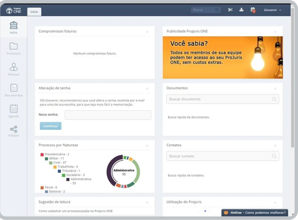 O sistema PROJURIS ONE também permite o compartilhamento de peças como petições, decisões e sentenças, além de avisar com antecedência, por e mail, os compromissos relacionados aos processos, como reuniões e audiências.